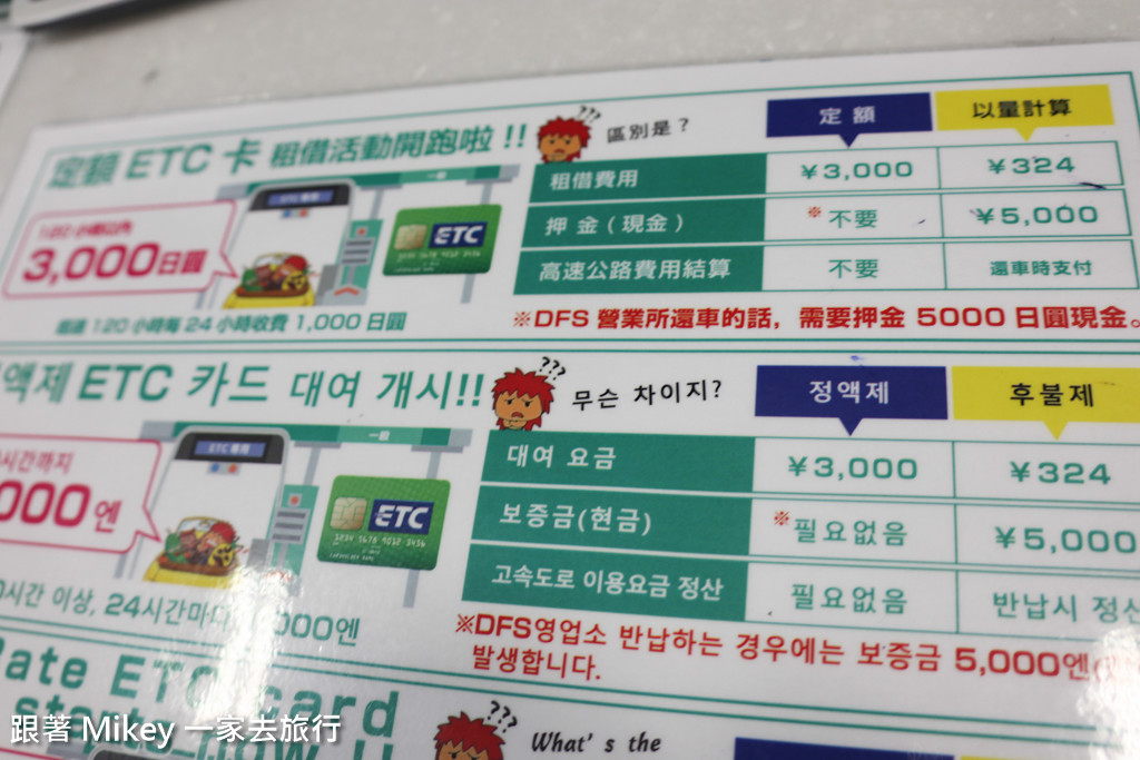沖繩為右駕,與台灣方向不同, 如果會南北跑高速公路的話, 最好買 ETC 卡, 比較方便! 另外, 記得一定要買豪華安心保險,這樣開車就無後顧之憂了! |
