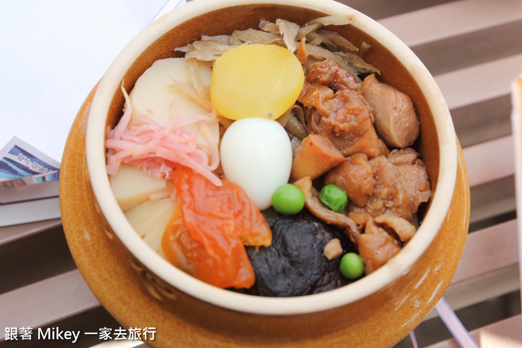 掀開蓋子一看, WOW~ 滿滿的雞肉、筍片、香菇、栗子、牛蒡、鵪鶉蛋全都覆蓋在白飯之上, 好豐盛啊! ^0^ |