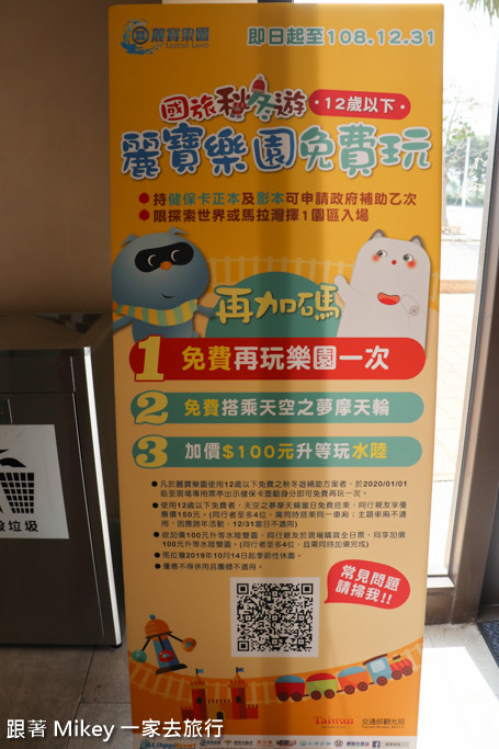 觀光局 2019/9/1 至 2019/12/31 推出秋冬旅遊補助方案,12 歲以下兒童除了可免費玩樂園外,還可免費搭乘摩天輪等設施,兩大兩小家庭最高可省超過 2 千元。 ( 資料來源 : 麗寶樂園渡假區秋冬遊補助再加碼 ) |