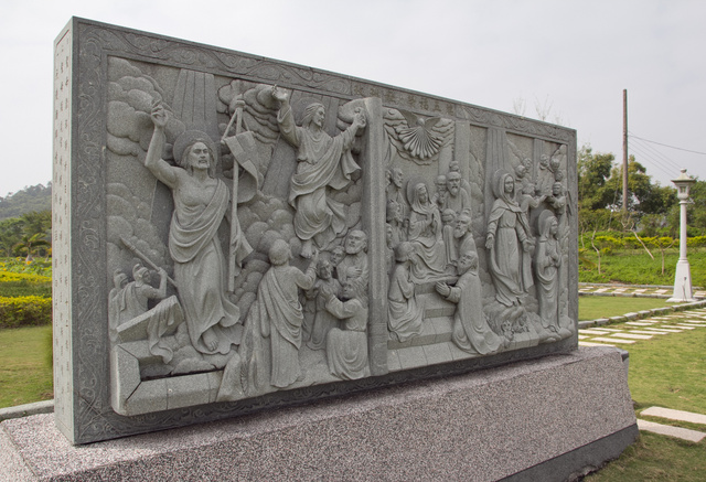 花園廣場上,擺放著許多巨大石頭,裡面還刻有耶穌當年受難時的相關情景。 |