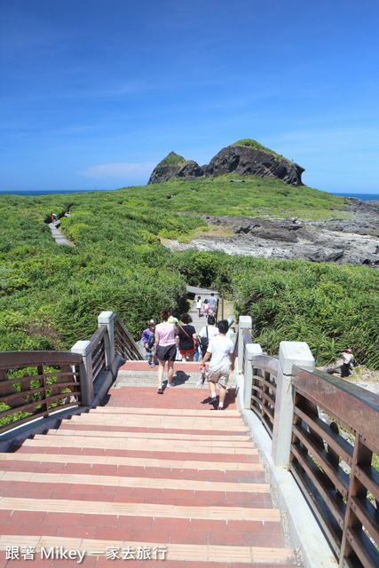 若要繞島,我個人建議往休息亭的右邊走起,因為有海風吹拂及較多岩石遮蔽物,走起來比較涼爽。 |