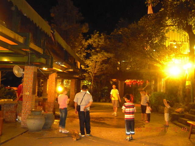 聽說晚上會有精采的表演,不少今晚入住的房客,都陸續聚集在廣場中,在表演開始前,先開心地玩起打陀螺。 |