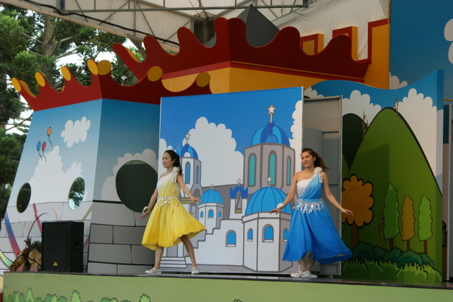 果然穿著希臘服裝的女舞者,正在和 OPEN 將、條碼貓,載歌載舞。 |